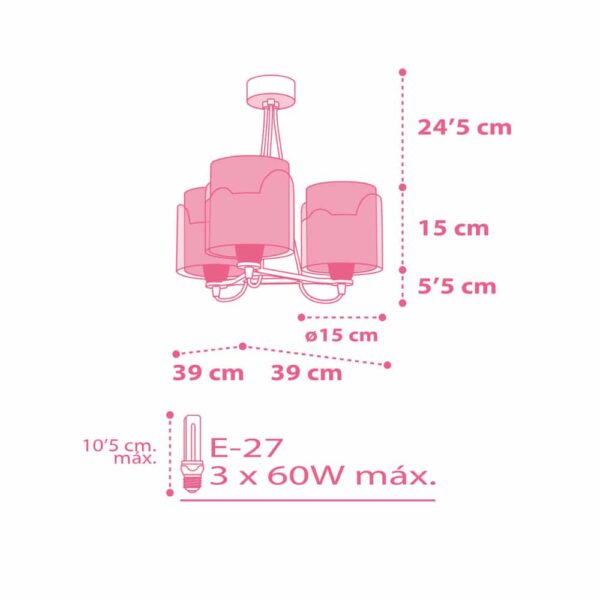Μοντέρνα, τριγωνική κατασκευή με τρία φωτεινά σώματα σε κάθε γωνία και ανάλογες θέσεις λαμπτήρων. Κατασκευασμένο με διπλά τοιχώματα προσφέρει άπλετο φως, διασκεδαστικό χαρακτήρα και χρώμα σε κάθε σημείο του παιδικού δωματίου. Απόλυτα ασφαλές ώστε τα παιδιά να μπορούν να μελετήσουν, να παίξουν και να κοιμηθούν παρέα με το αγαπημένο τους θέμα. Κατασκευάζεται εξ ολοκλήρου στην Ευρώπη και συμπληρώνει τα υπόλοιπα φωτιστικά της συλλογής.