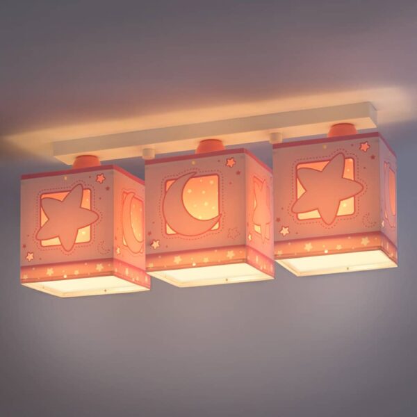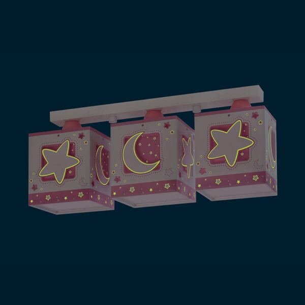 Καλωσορίστε το παιδί σας σε ένα παιδικό δωμάτιο πλημμυρισμένο από μαγεία με αυτό το μοναδικό στο είδος του τρίφωτο φωτιστικό οροφής κατάλληλο για γενικό φωτισμό. Προσθέτει διασκεδαστικό χαρακτήρα και χρώμα σε κάθε παιδικό δωμάτιο. Παρέχει ομοιόμορφο και άπλετο φωτισμό δημιουργώντας περιβάλλον που ενθαρρύνει τα παιδιά να επιδοθούν σε ότι τους αρέσει περισσότερο τόσο στην διασκέδαση όσο και την δημιουργικότητα! Είναι κατασκευασμένο στην Ευρώπη και απόλυτα ασφαλές ώστε τα παιδιά να μπορούν να μελετήσουν, να παίξουν και να κοιμηθούν παρέα με τον αγαπημένο τους ήρωα. Η μαγεία συνεχίζετε ακόμα και στο σκοτάδι με τα φωσφορίζοντα μέρη του στο εξωτερικό τοίχωμα των φωτιστικών του σωμάτων. Το MoonLight Pink τρίφωτο φωτιστικό οροφής σε ράγα συμπληρώνει τα υπόλοιπα παιδικά φωτιστικά της συλλογής.