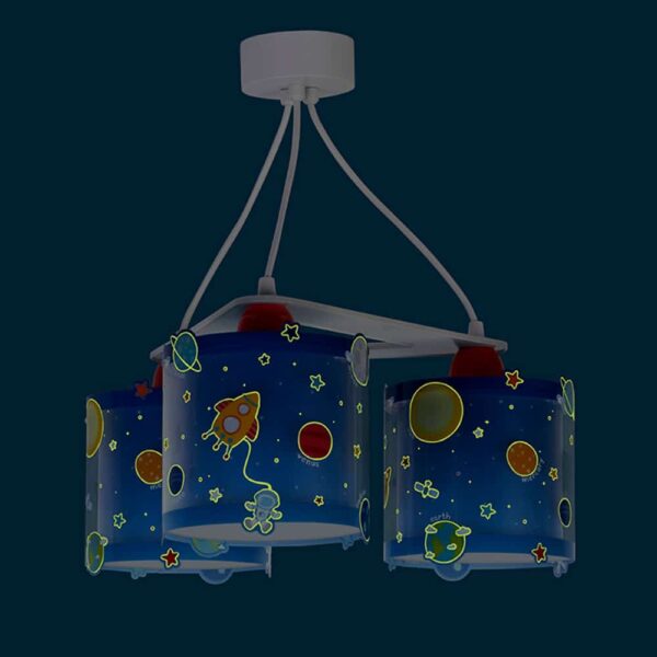 Μοντέρνα, τριγωνική κατασκευή με τρία φωτεινά σώματα σε κάθε γωνία και ανάλογες θέσεις λαμπτήρων. Κατασκευασμένο με διπλά τοιχώματα και φωσφορίζοντα μέρη στο σκοτάδι προσφέρει άπλετο φως, διασκεδαστικό χαρακτήρα και χρώμα σε κάθε σημείο του παιδικού δωματίου. Απόλυτα ασφαλές ώστε τα παιδιά να μπορούν να μελετήσουν, να παίξουν και να κοιμηθούν παρέα με το αγαπημένο τους θέμα. Κατασκευάζεται εξ ολοκλήρου στην Ευρώπη και συμπληρώνει τα υπόλοιπα φωτιστικά της συλλογής.